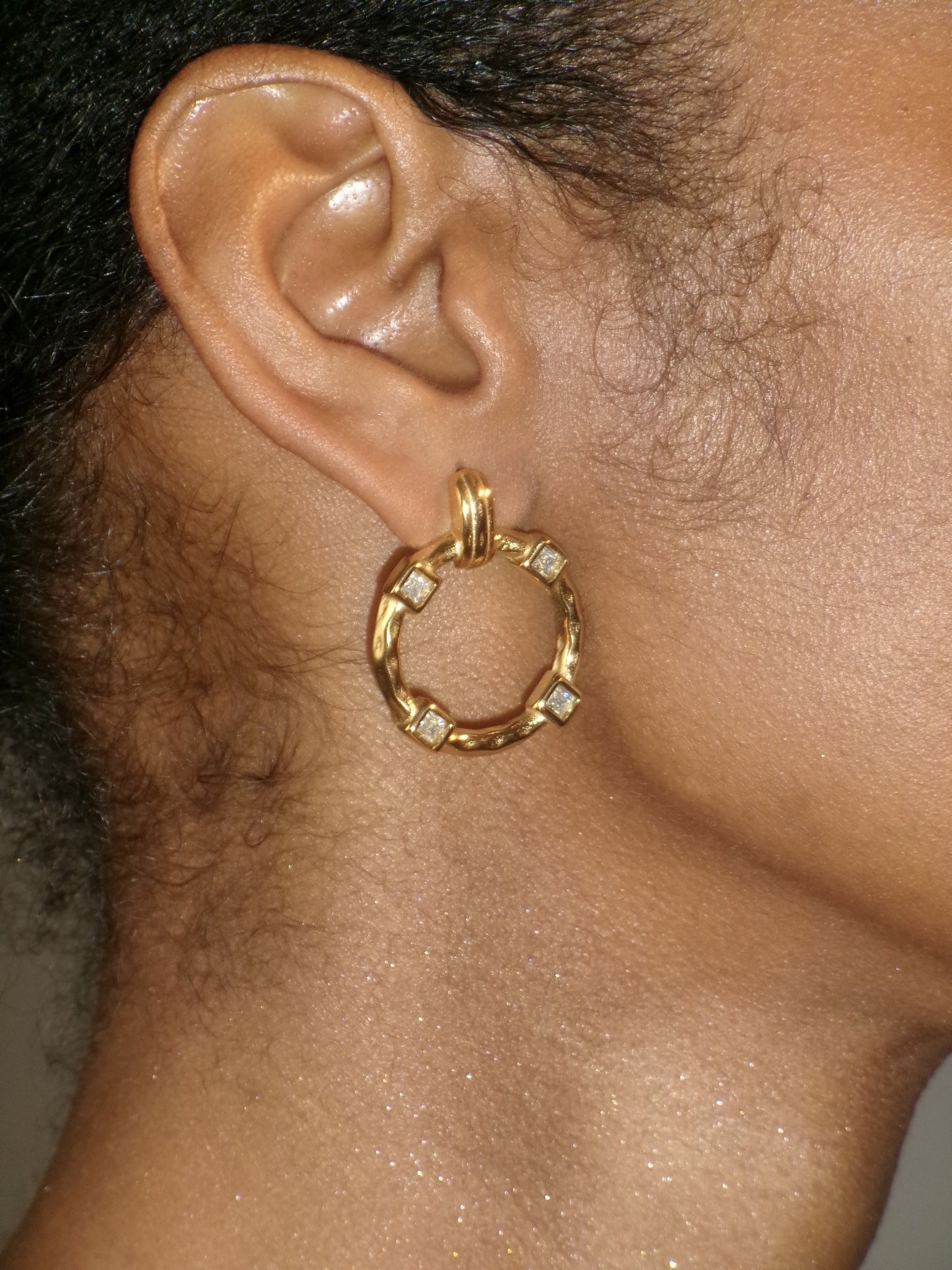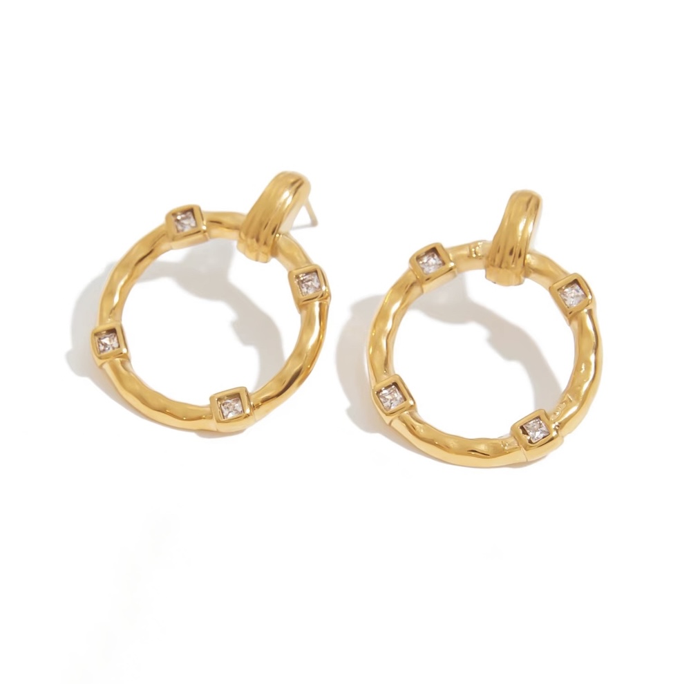 Embrace modern elegance with these captivating gold-tone earrings, featuring a distinctive hammered texture and strategically placed square-cut crystals that add a subtle yet striking sparkle, making them the perfect versatile accessory to elevate everything from your casual chic daytime ensembles to your most sophisticated evening attire.